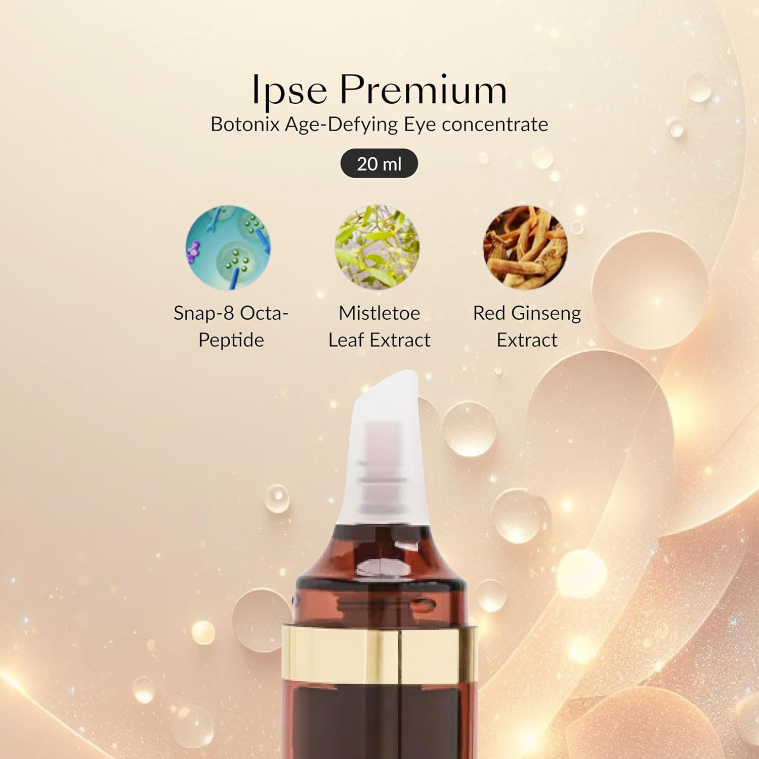 IPSE Premium eye lifting serum concentrate with SNAP-8 complex is designed to maximize wrinkle reduction and provide a long-lasting visible effect, stimulating collagen production. Adenosine delivers a pronounced anti-aging effect by reducing wrinkles and promoting the synthesis of collagen and elastin. The SNAP-8 complex (8 types of natural amino acids) is IPSE Premium's solution for combating aging, stimulating collagen production. Thus, the eye lifting serum concentrate fights wrinkles and gives the skin a smoother texture and a youthful appearance. Ginseng root extract tones and energizes the skin, helping it resist stress and negative environmental factors. Key Product Details: Fights wrinkles, Stimulates collagen synthesis, Provides a long-term effect